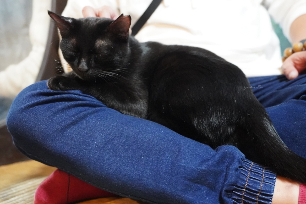 選定了落地窗邊特別暖的塌塌米座位,桌旁擺置著古樸色調的暖爐以及一張深藍色貓床,睡著明顯體弱的黑貓。老爺爺確認暖爐是否正常運作的同時,視線也溫柔落向軟墊中的黑貓、輕聲道:「13歲了。」與方才迎接我們的黑貓整整差了十餘歲,換算人類的年紀,竟如一對爺孫;看盡世事已超然獨立的黑貓爺爺,對於龐然大物(友人)坐落身旁無動於衷、不畏懼也不討好,不像那隻小黑貓,翹起尾巴任由我拍屁股,後來更是直接窩在友人身上睡覺,大有初生之貓不畏人的憨膽樣。